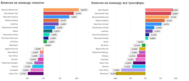 Наилучшее влияние на оценку команды в лиге показали покупки Боруссии Дортмунд (+10.6% к средней оценке команды). Далее идет Манчестер Сити (+ 9.1%). Худшее влияние у игроков Астон Виллы (-4.7%). По всем трансферам лучшее усиление было у Реал Мадрид (+9%) и Мачестер Сити (+8.5%). Худшее усиление предоставили своим командам игроки принадлежащие Барселоне (-9.7%) и Интеру (-7.9%).