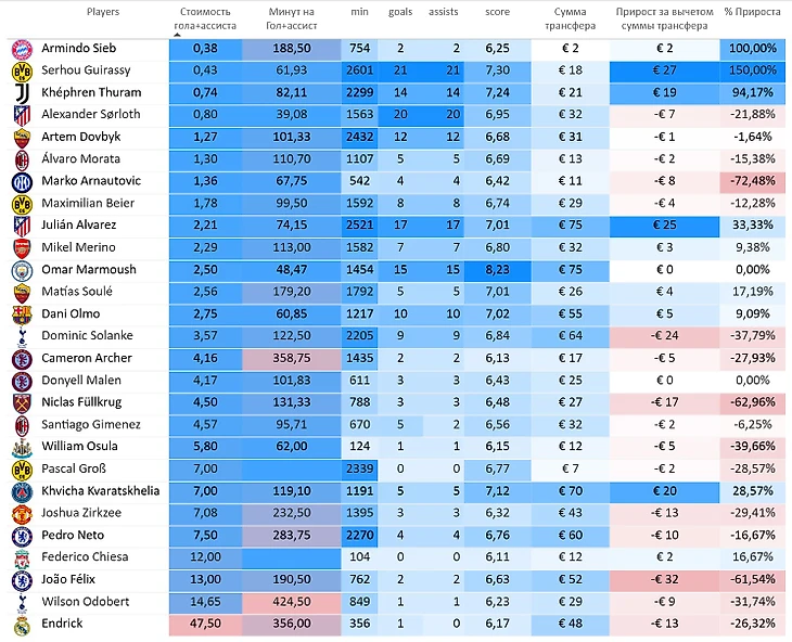 Лучшим трансфером сезона по приросту рыночной стоимости стал переход Майкла Олисе из «Кристал Пэлас» в «Баварию»: клуб заплатил 52 млн евро (почти на 4% ниже рыночной оценки), а к концу сезона стоимость игрока взлетела до 100 млн евро – впечатляющий 88% прирост. На втором месте – Дезире Дуэ: хотя «ПСЖ» переплатил «Ренну» за трансфер, инвестиция полностью окупилась – игрок удвоил свою стоимость и теперь оценивается на 80% дороже приобретенной цены. Замыкает тройку лидеров Серу Гирасси, купленный у «Штутгарта» со значительной скидкой к рыночной стоимости и еще прибавил в цене 12,5%. Отдельного упоминания заслуживает сделка с Анхелиньо: «Рома» приобрела защитника «Лейпцига» за 48% ниже рыночной цены, а его стоимость за сезон выросла в 1,5 раза. Неожиданным героем «Милана» стал воспитанник «Реала» Алекс Хименес с рекордным процентным ростом рыночной стоимости с 0 до 15 млн.