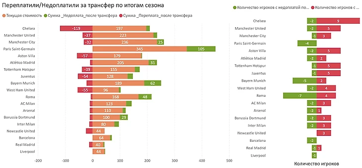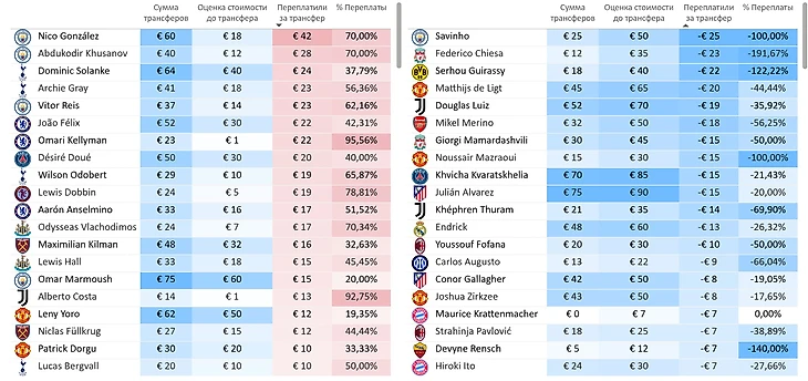 Крупнейшие сделки с переплатой и недоплатой у «Манчестер Сити» – Нико Гонсалес (+42 млн) и Савиньо (-25 млн). За Дезире Дуэ «ПСЖ» пришлось заплатить на 40% больше рыночной стоимости или 20 млн евро, а сделки с Кьезой, Дугласом Луисом и Эндриком в моменте казались очень удачными.