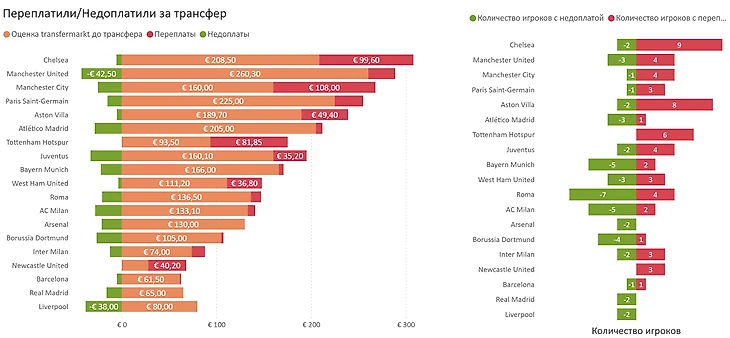 Если большинство клубов сочетали переплаты за одних игроков с выгодными приобретениями других, то английские «Тоттенхэм» и «Ньюкасл» выделяются тем, что переплатили за каждого своего новичка, причем в процентном соотношении их переплаты оказались даже существеннее, чем у традиционного лидера по абсолютным расходам – «Челси». «Астон Вилла» и «Вест Хэм» также были готовы к существенным переплатам ради усиления состава. Английские клубы в целом готовы платить значительную премию за приобретение приоритетных целей, исключением является «Ливерпуль», который как и «Реал Мадрид» потратил меньше всех и провел наиболее взвешенную кампанию, минимально отклоняясь от рыночных оценок игроков. «Атлетико Мадрид» и «Боруссия Дортмунд» также провели взвешенную кампанию.