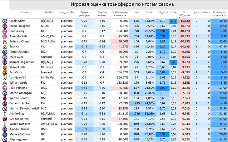 Абсолютным антилидером сезона по динамике рыночной стоимости стал трансфер Жоау Феликса в «Челси»: лондонский клуб переплатил за «вечно талантливого» португальца из «Атлетико» 22 млн евро, а его стоимость за сезон снизилась на 10 млн евро (аренда в «Милане» не помогла восстановить репутацию), что в итоге дало катастрофические минус 32 млн евро к первоначальной инвестиции «Челси». Однако если анализировать процентное соотношение текущей стоимости к трансферной сумме, то звание худшей сделки сезона 2024-2025 переходит к Омари Келлиману – менеджеры «Челси» почему-то решили заплатить 23 млн евро за игрока молодежного состава «Астон Виллы», чья рыночная оценка составляла лишь 1 млн евро, а за сезон выросла всего на 1 млн евро, что означает чудовищную переплату в 93% от текущей стоимости игрока. Эти два трансфера ярчайшим образом демонстрируют кризис скаутской системы «Челси», допустившей сразу две большие ошибки в одном трансферном окне.