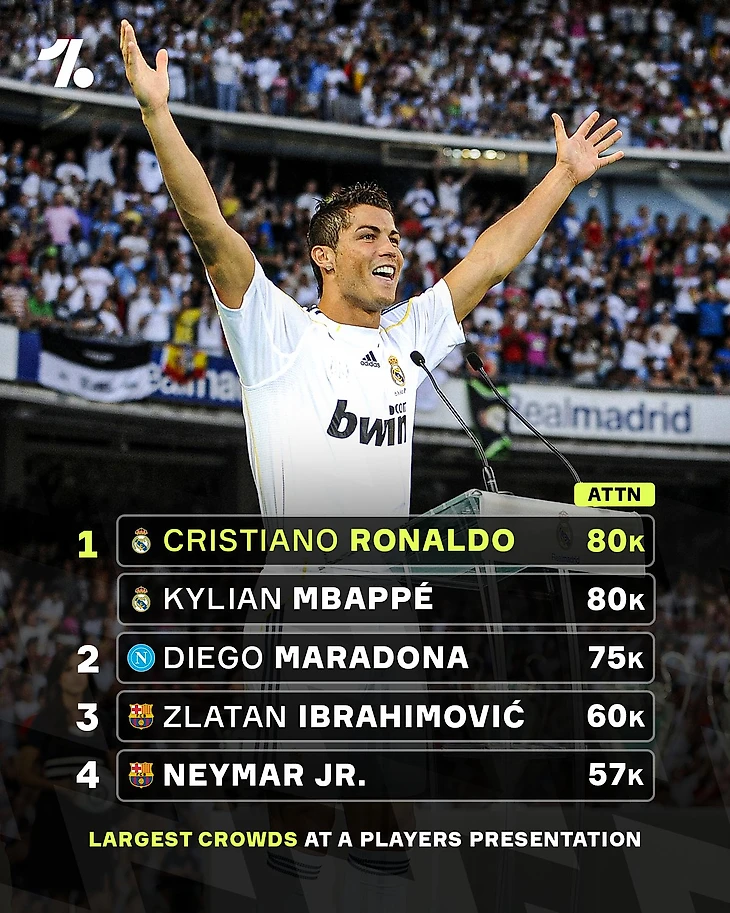 Килиан и Криштиану – рекордсмены по аудитории, которую они собрали на своих презентациях. Новичков «сливочных» на «Сантьяго Бернабеу» приветствовали около 80-ти тысяч человек!