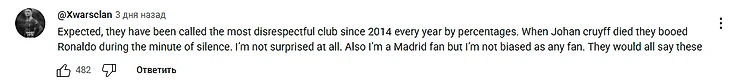 «Ожидаемо, их называли самым неуважительным клубом с 2014 года каждый год по процентному соотношению. Когда умер Йохан Кройф, они освистали Роналду во время минуты молчания. Я совсем не удивлен. Также я фанат Мадрида, но я не предвзят, как любой другой фанат. Они все сказали бы это».
