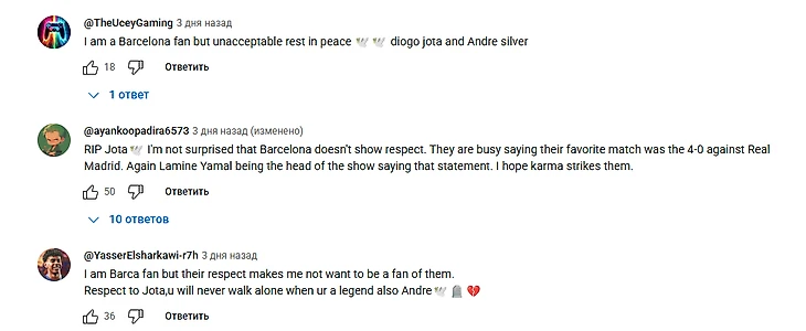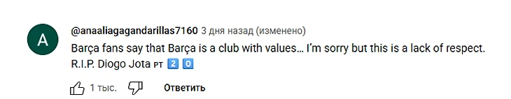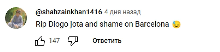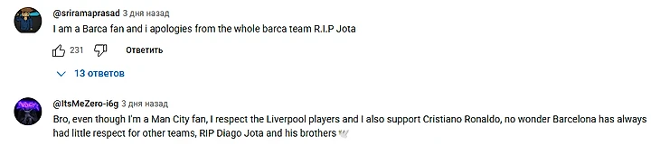 «Братан, хоть я и фанат «Манчестер Сити», я уважаю игроков «Ливерпуля», а также поддерживаю Криштиану Роналду, неудивительно, что «Барселона» всегда мало уважала другие команды. Покойся с миром, Диаго Жота и его братья🕊️»