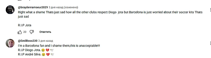 «Я фанат Барселоны и мне стыдно за них, это неприемлемо!!! R.I.P Диогу Жота.😢💔 R.I.P Андре Силва.😢💔🕊»