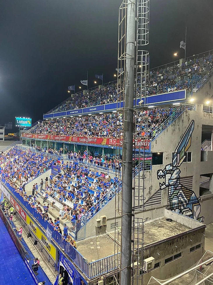 Это уютная, почти камерная арена без беговых дорожек, но с высоким забором по периметру поля. Три отдельных трибуны, две из них за воротами и одна – центральная (совсем недавно, уже после описываемого матча, стадион обзавелся и четвертой, увеличив вместимость до 15114). Все под рукой: сектора расположены близко к полю, создавая плотную, «горшечную» акустику, а перед главным входом находится целый мини-рынок с местными специалитетами. На стене одной из трибун граффити – зубастый кролик. Это символ «Би Джи Патхум Юнайтед»: первый президент клуба родился в год кролика по китайскому календарю. Прозвище у клуба соответствующее – The Rabbits.