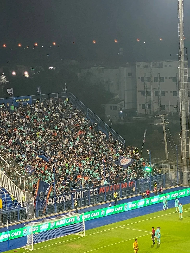 трибуне слева, с большим электронным табло. Море синих футболок, баннеры, двуручники и не смолкавшие весь матч барабаны. Что удивительно, гостевой сектор выделен… на той же трибуне. Отгороженный от хозяев несколькими рядами сетки, он заполнился на 95%.