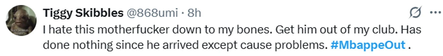 💭 «Ненавижу этого ублюдка до мозга костей. Вышвырните его из моего клуба. С момента перехода он не делает ничего, только создает проблемы. #MbappeOut».