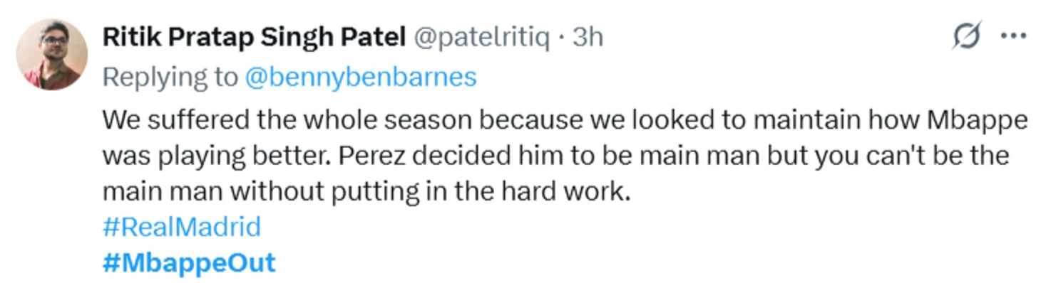 💭 «Мы страдали весь сезон, потому что старались играть так, как будет лучше для Мбаппе. Перес решил, что он будет главным игроком, но нельзя стать главным игроком, не приложив достаточно усилий. #RealMadrid #MbappeOut».