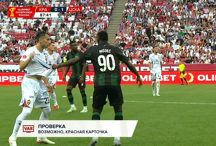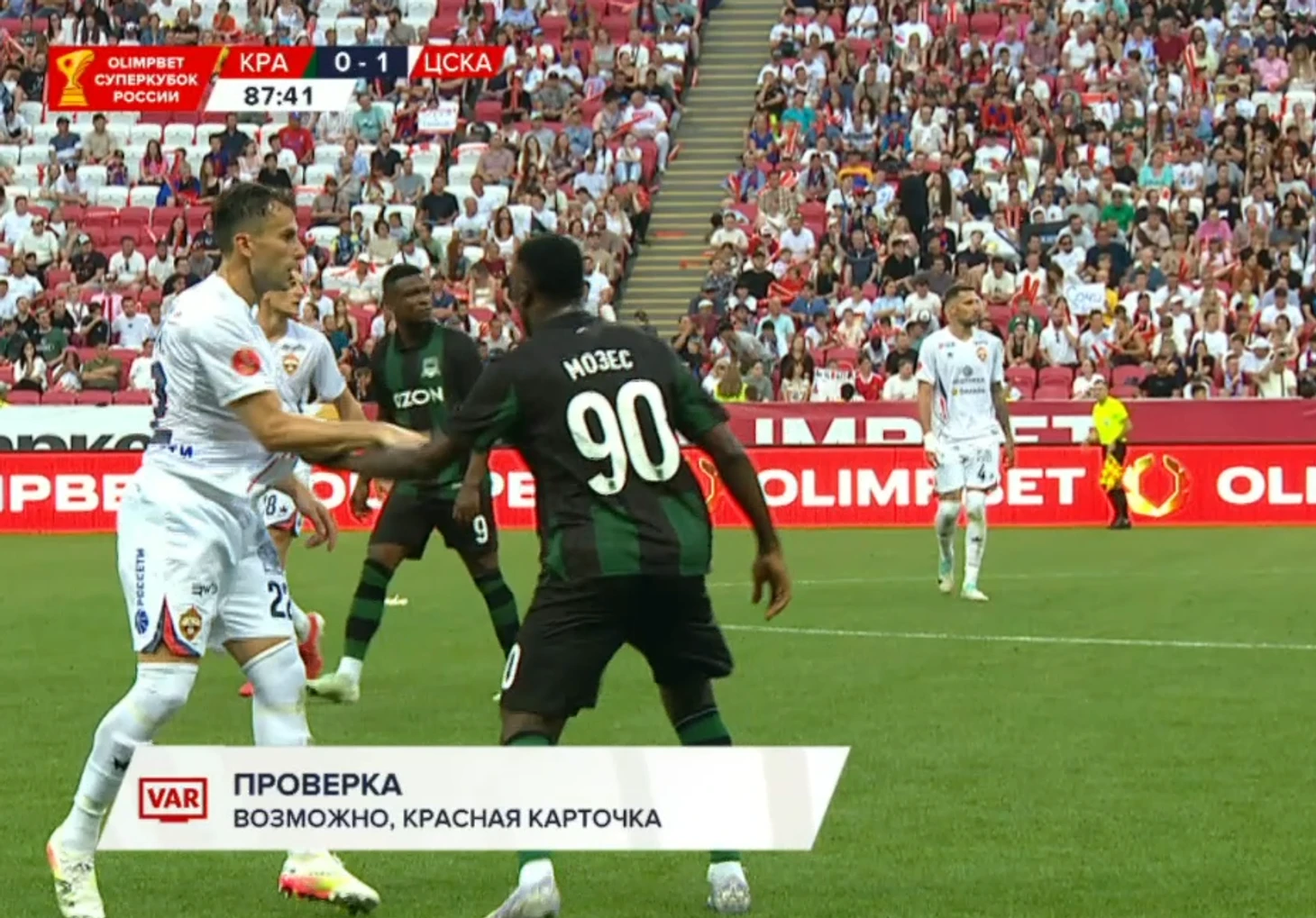 В матче за Olimpbet Суперкубок России «Краснодар» проигрывал 0:1 ЦСКА и в самом конце остался вдесятером. Это Мозес Кобнан Дэвид хлопнул по лицу Милана Гайича и удалился.