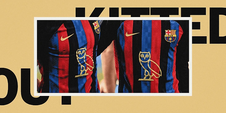 На верхнем фото: футболка «Барселоны» сезона 2022/23 с логотипом OVO Sound — лейбла Дрейка. Фото: David Ramos / Getty Images. Дизайн: Деметриус Робинсон / The Athletic