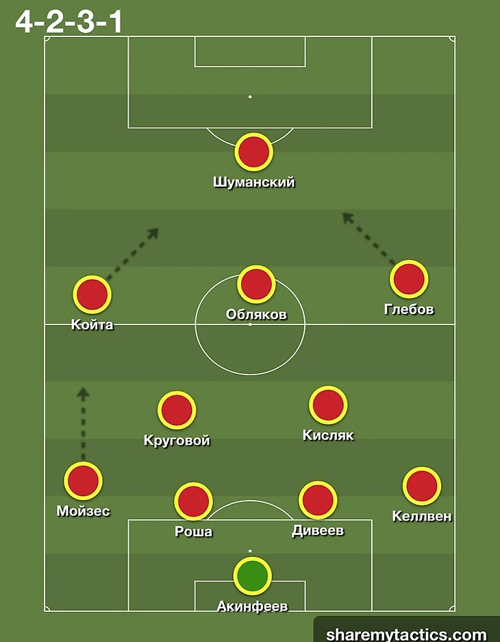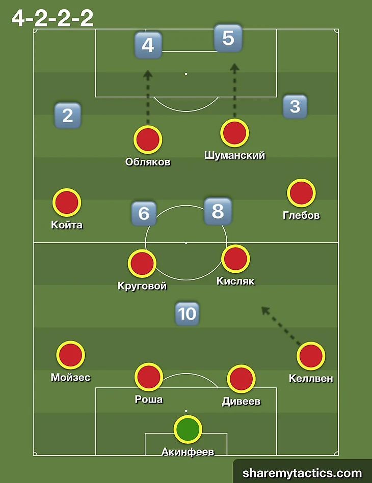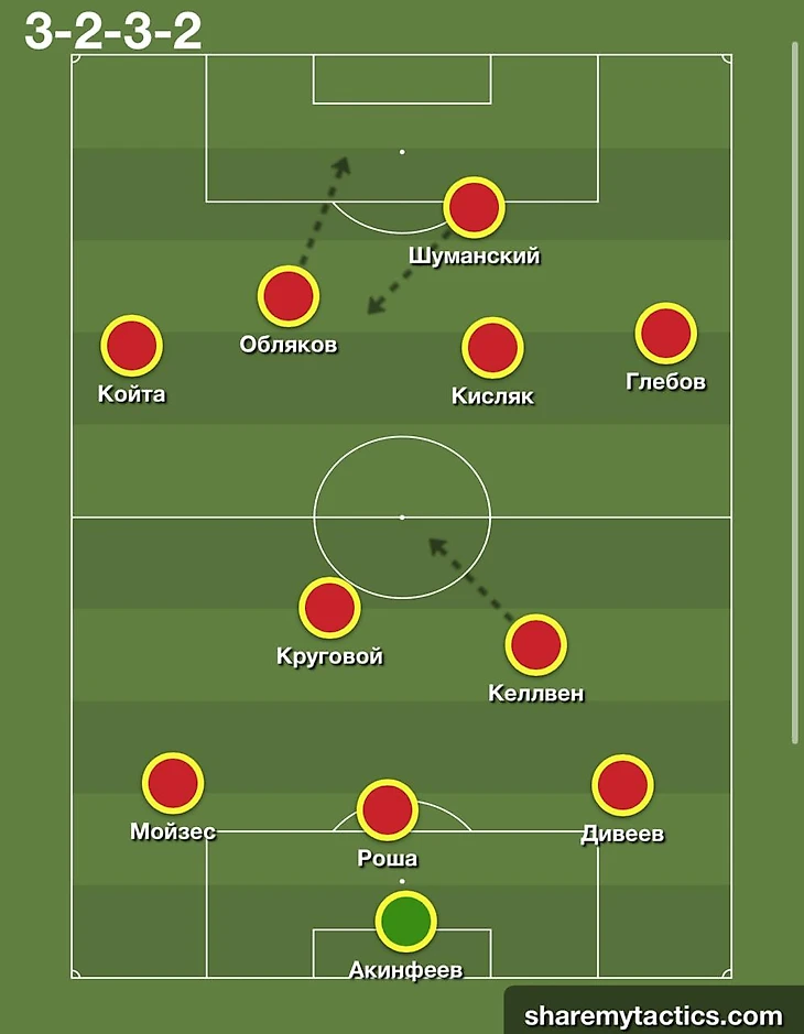 • Давление на центральных защитников: Шуманский и Мусаев постоянно напрягали центр обороны «Краснодара», поэтому пара Шуманский и (поднявшийся на один уровень поля с ним в нашей формации) Обляков - выглядят как ещё более агрессивная пара для первой волны давления.