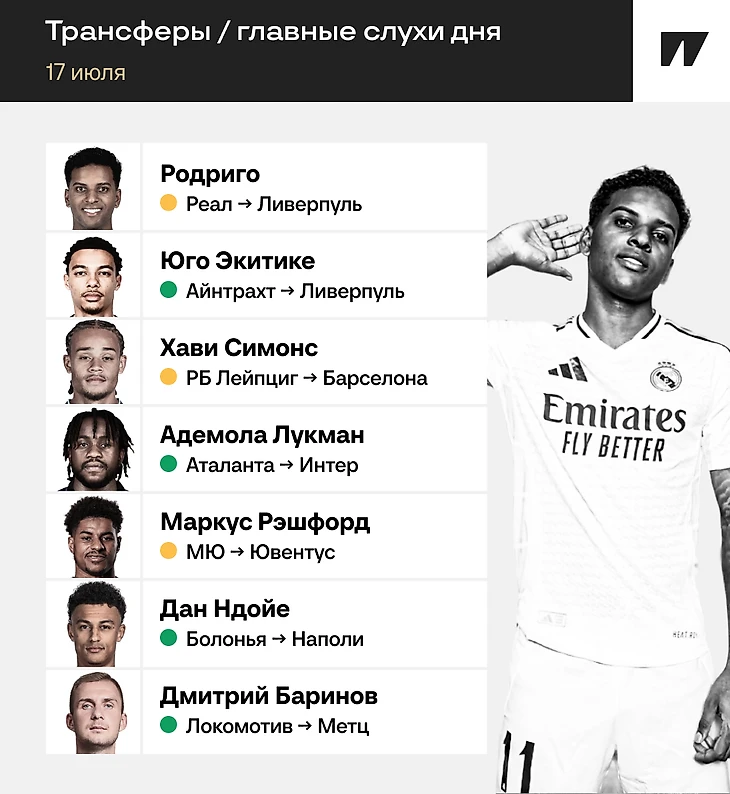Родриго и Экитике близки к «Ливерпулю», Хави Симонс хочет в «Барсу», Баринова ждут во Франции. Главные инсайды дня
