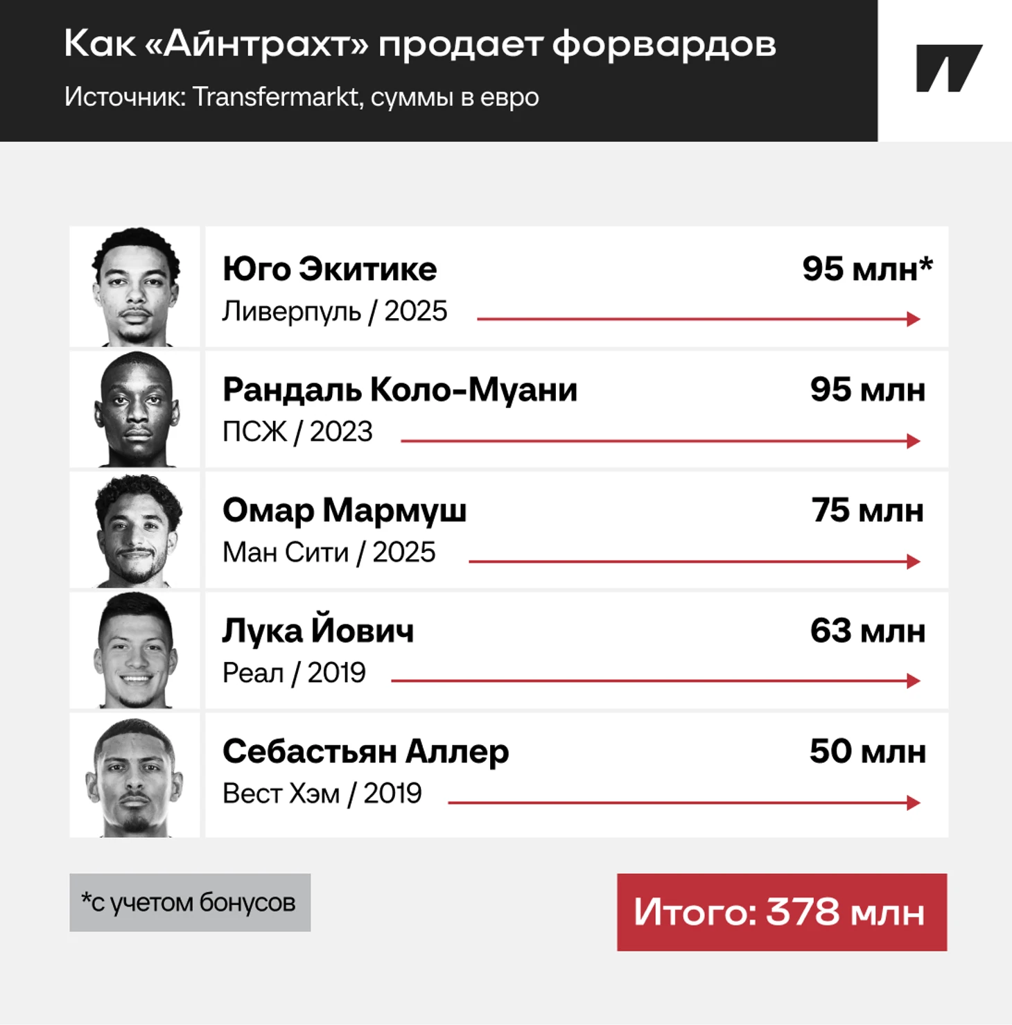 Трансферный баланс с учетом продажи Экитике – плюс 225 млн евро. Это шестое место в мире после таких же мастеров продаж: «Бенфики», «Аякса», «Лилля», «РБ Зальцбурга» и ПСВ. У франкфуртцев лучший баланс в Германии.
