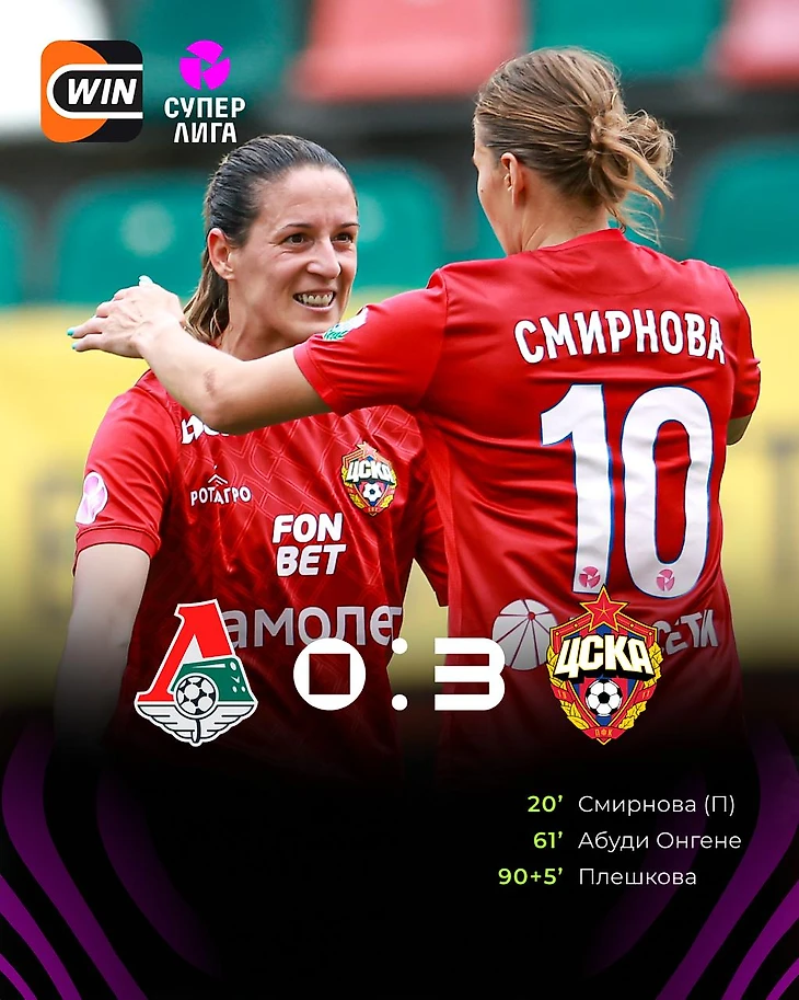 ЦСКА неплохо начал матч, создавали давление у ворот «Локомотива» и в результате чего заработали пенальти, который уверенно реализовала Надежда Смирнова. Вообще для меня Смирнова сейчас одна из лучших игроков этого сезона, наверное, наряду с Филипович из «Спартака». Она прям очень сильно влияет на игру армейцев, которые, к слову, не отходят от своей стратегии и продолжают добиваться результата за счет стандартов. Вот и игра с «Локомотивом» не стала исключением.