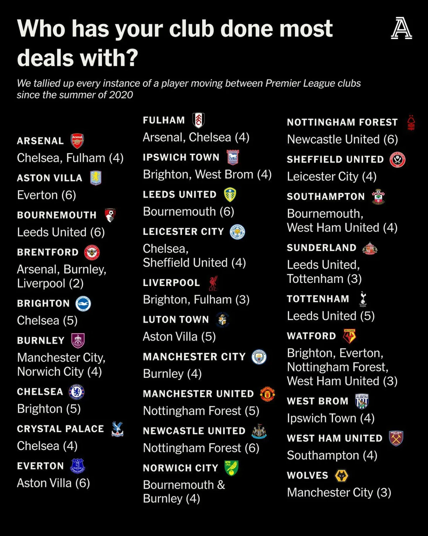 Перед стартом нового сезона The Athletic выкатил масштабное исследование по АПЛ. Одну из график они посвятили трансферному взаимодействию между клубами внутри лиги.