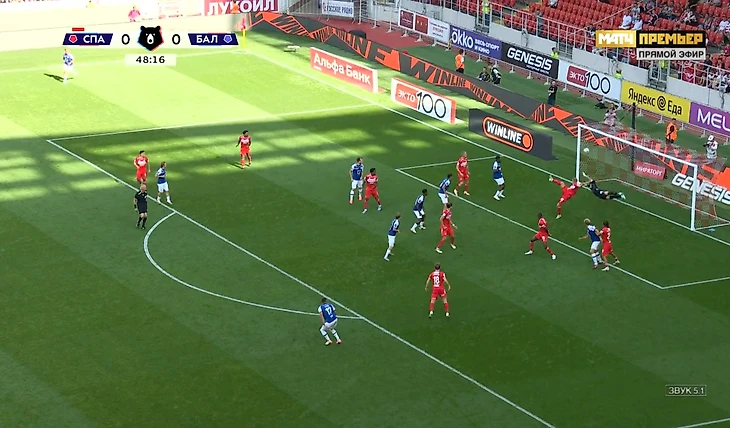 После удаления Антона Заболотного «Спартак» в меньшинстве продержался против «Балтики» почти 40 минут. Но против фантастического удара Владислава Сауся ничего поделать не смогла ни защита, ни вратарь Александр Максименко.