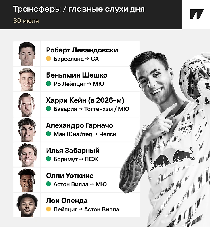 «Манчестер Юнайтед» отправил в Германию секретную делегацию для переговоров по Беньямину Шешко. «Юнайтед» пытается сбить цену до 60 млн фунтов. Рубен Аморим предпочитает словенцу опытного Олли Уоткинса из «Астон Виллы», а вот трансфер Шешко продвигает директор скаутов Кристофер Вивелл.