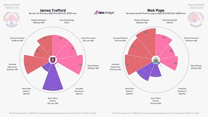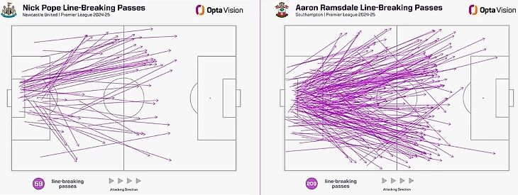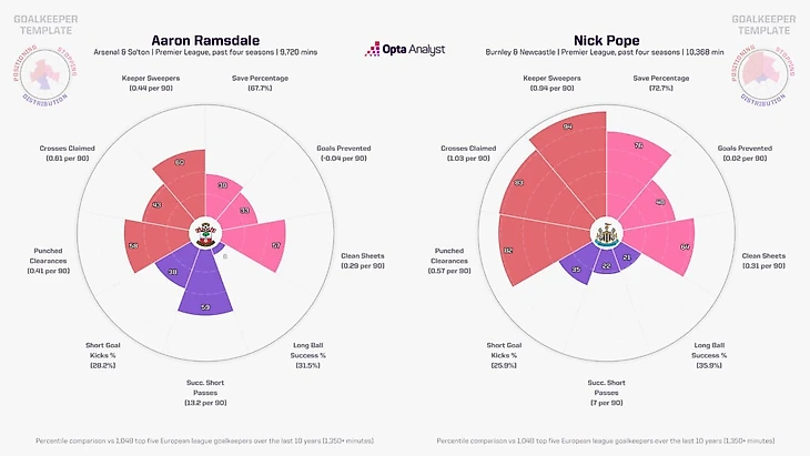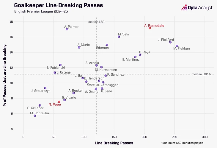 Здесь разница между Рамсдейлом и Поупом разительна. В прошлом сезоне Рамсдейл выполнил 209 прорывных передач (третий результат среди всех вратарей лиги), тогда как Поуп — всего 59.