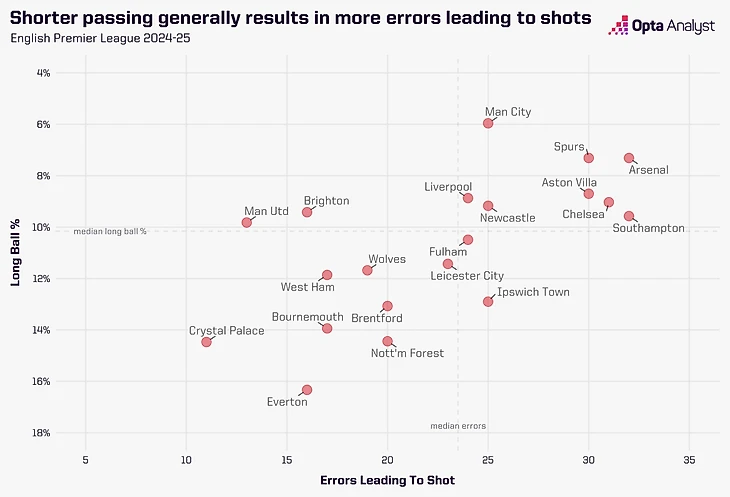 При этом важно отметить: игра от ворот — не догма. Хотя не все ошибки, ведущие к ударам по воротам, связаны с короткими передачами, статистическая корреляция между риском потери мяча и подобным стилем игры действительно прослеживается.