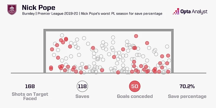 В сезоне-2019/20 Поуп отразил лишь 70,2% ударов в створ — это его худший показатель в карьере в Премьер-лиге. Однако даже этот «провальный» для него результат превосходит лучший показатель Рамсдейла в АПЛ (69,9% в 2020/21).