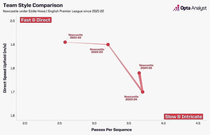 Это соответствует общей эволюции «Ньюкасла» при Хау: команда стала играть более осмысленно и сложно в пасе, что наглядно видно на графике ниже.