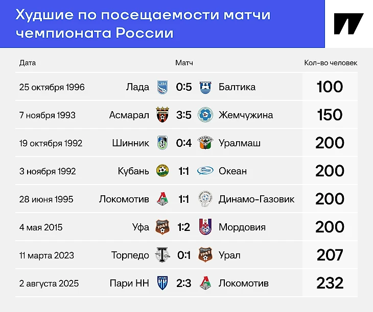 Если взять шире XXI-го века, то в истории чемпионата России есть два матча с посещаемостью ниже 200 фанов: «Лада» – «Балтика» в октябре 1996-го и «Асмарал» – «Жемчужина» в ноябре 1993-го. Ажиотаж в Грозном даже не рядом с рекордсменами.