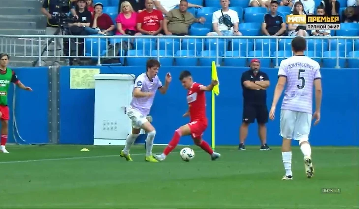 А в добавленное время все внимание перехватил спартаковец Даниил Хлусевич, получивший две желтые карточки за минуту! На 45+1 он сбил Роберто Фернандеса Торо рядом с центральным кругом, а на 45+2 грубо наступил на ногу Максиму Бодыреву.