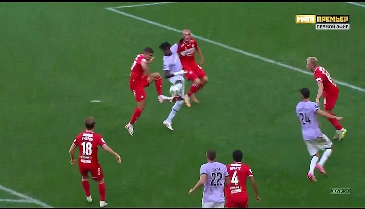 Но на этом игра не закончилась. Через мгновение Дзюба головой скинул мяч в чужую штрафную, где Роман Зобнин ногой задел соперника. Кукуян посчитал, что это пенальти.