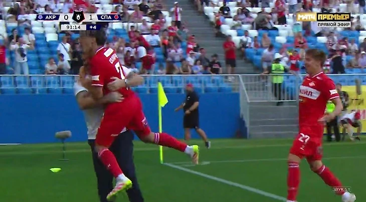 А «Спартаку» пришлось реагировать на удаление – новичка Жедсона заменили уже в перерыве. Правда, команда Станковича продолжила добавлять себе проблем. На 60-й минуте игрок «Акрона» упал в момент контакта с вратарем Александром Максименко. Кукуян не усмотрел оснований для пенальти, но ВАР вмешался и позвал судью к монитору.