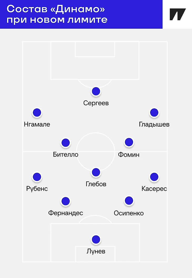 «Динамо» вписывается. Если поменять Рубенса на Зайнутдинова, можно даже выпустить лишнего иностранца. Старт подвижный, почти у всех есть прямые альтернативы. Например, вместо россиянина Сергеева – Тюкавин, иностранца Нгамале могут заменить Артур или Луис Чавес (тогда Бителло уйдет на фланг), когда поправятся. Для Рубенса есть легитимная альтерантива в лице Скопинцева и Зайнутдинова.