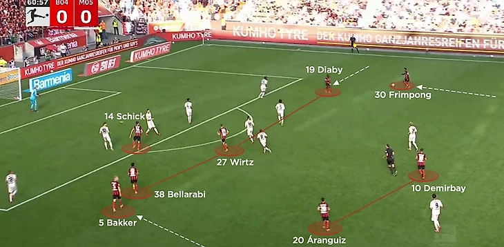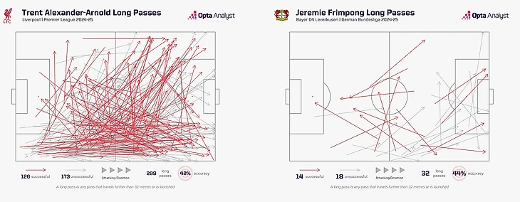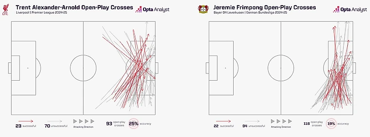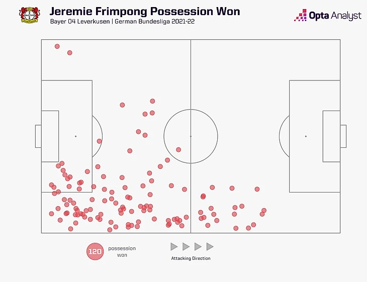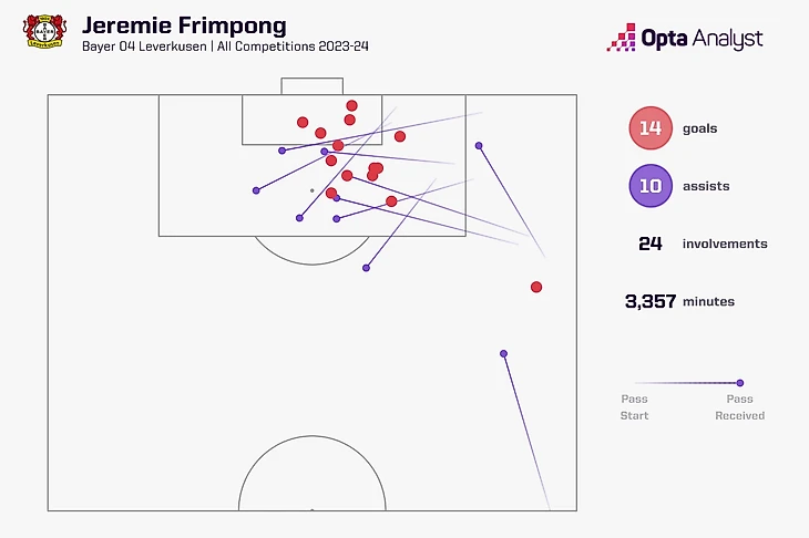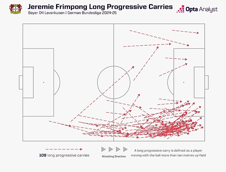Фримпонг действует ближе к чужой штрафной, чем любой другой защитник лиги. 117 касаний в штрафной — третье место в команде. Только Вирц и Шик чаще получали мяч в чужой зоне. У Трента таких касаний — меньше двух за матч, у Фримпонга — больше четырёх.