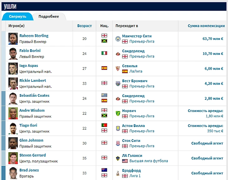 Данный сезон можно ознаменовать как начало перестройки состава. В первую очередь это, конечно, связано с уходом ключевого игрока. Также страдал левый фланг обороны, Аггера замучали травмы, Сако и Шкртел много ошибались, не хватало творчества в центре поля. Роджерс играл ромбом, но после ухода Суареса нужно было переходить на современную формацию 4-3-3. Джеррард пережил вторую молодость, но так или иначе нужны были игроки в центр. В общем и целом, тот состав, который практически взял АПЛ, выжал из себя максимум, и нужны были новые вливания. В этом случае начнем с ушедших игроков.