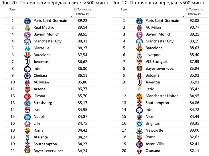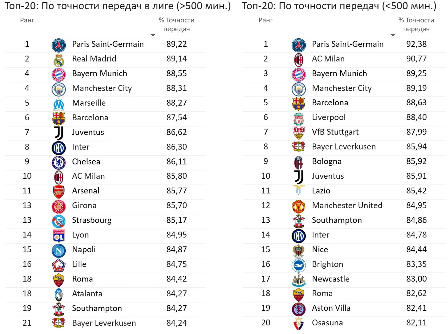 Очевидно, что чем сильнее команда, тем выше точность передач, хотя в данную формулу может сильно вмешиваться стиль игры. Ожидаемо лидирует «ПСЖ», а вот 5 позиция «Марселя» или 12 позиция «Жироны» может кого-то удивить. У «Милана» был провальный сезон в лиге, зато по точности передач игроков обоймы находится на 10 месте в топ-5 лигах, что является ярким подтверждением того, что большое количество точных передач не может гарантировать результата. Среди игроков сыгравших менее 500 минут «Милан» и вовсе на 2 месте. Запасные «Ливерпуля» демонстирировали заметно более высокую точность, чем основные игроки (88.5% против 83.76%).