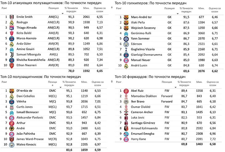 Среди атакующих полузащитников лучший - Имит Смит-Роу из «Фулхэма» с 91.3%, на втором месте - Родриго из «Реала» с 90.9%. Впечатляет высокая точность передач у Хвичи Кварацхелии (89.3%), грузин сочетает точность с большим количеством голевых передач. Среди полузащитников в топе рейтинга выделяется Витинья - у игрока «ПСЖ» сыграно более 2000 минут и имеет высокий рейтинговый балл (7.01). Если у полузащитников разброс по точности передач небольшой, то у голкиперов и форвардов очень высокий. Среди голкиперов сильно выделяется Марк-Андре тер Стеген с 91.5%, это выше чем у всех атакующих полузащитников, интересно, что в топ-3 все голкиперы одного клуба - «Барселона». Доннарумма кажется сильно улучшил свою работу с мячом в ногах, обойдя по точности передач Нойера, однако, все еще проигрывал Эдерсону (на эту тему был отдельный пост в моем telegram-канале). Абель Руис из «Жироны» лидирует среди форвардов, но его 4 гола за 1358 минут и невысокая оценка за сезон олицетворение банального вывода о том, что точные передачи - далеко не главный показатель эффективности нападающего (вероятнее всего, что для форвардов основной фактор  - результативные действия).