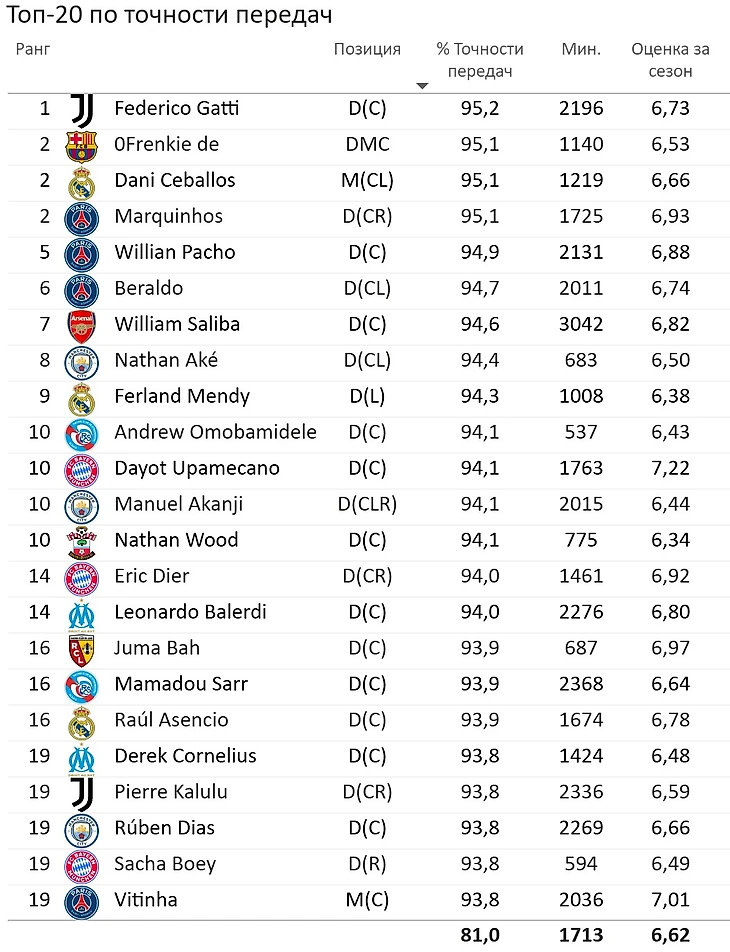 Для всех расчётов использованы данные WhoScored: в анализ включены игроки, отыгравшие не менее 500 минут в сезоне-24/25 в топ-5 лигах. Средняя точность передач составила 81%. В топ-20 лучших по этому показателю входят 17 защитников и лишь 3 полузащитника. Лидирует Фредерико Гатти из «Ювентуса» с точностью 95,2% при 2196 минутах на поле. За ним следуют полузащитники Френки де Йонг и Дани Себальос, чья специализация на коротких передачах обеспечивает им невероятно высокую точность для их амплуа. У «ПСЖ» в топ-20 представлено четыре игрока: три защитника — Маркиньос, Вильян Пачо и Лукас Бералдо — находятся почти на вершине рейтинга. В топе по 3 игрока у «Манчестер Сити», «Баварии» и «Реала». Особого внимания заслуживает Дайо Упамекано: он занимает 10-е место по точности передач и имеет самую высокую среднюю оценку WhoScored в топ-20 рейтинга.