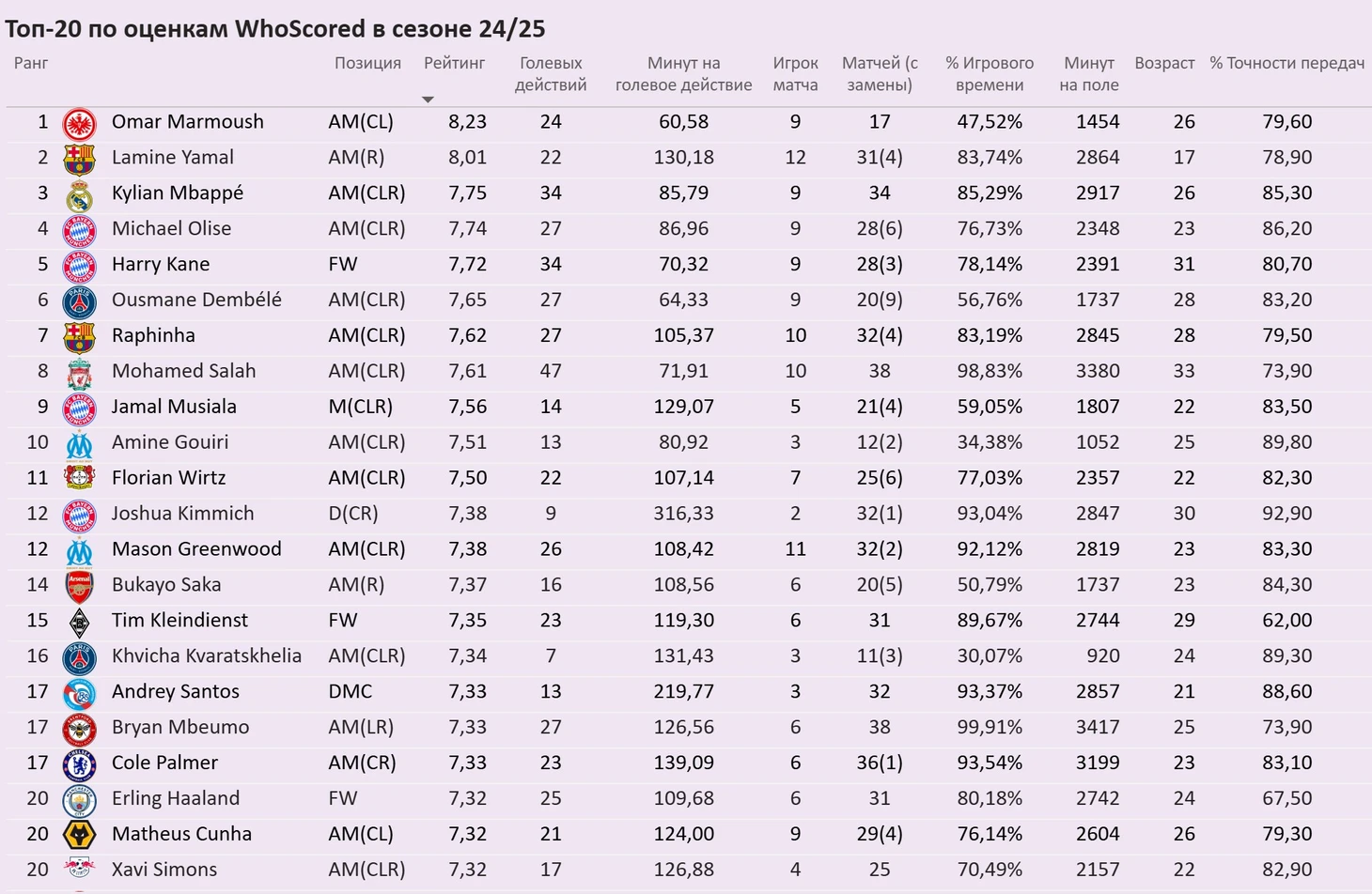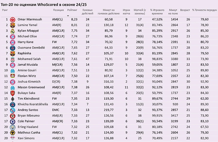 В топ-20 лучших игроков согласно оценкам WhoScored ни одного чистого защитника или голкипера, только два опорных полузащитника (Киммих, Сантос), 3-4 форварда, тогда как все остальные это — атакующие полузащитники.