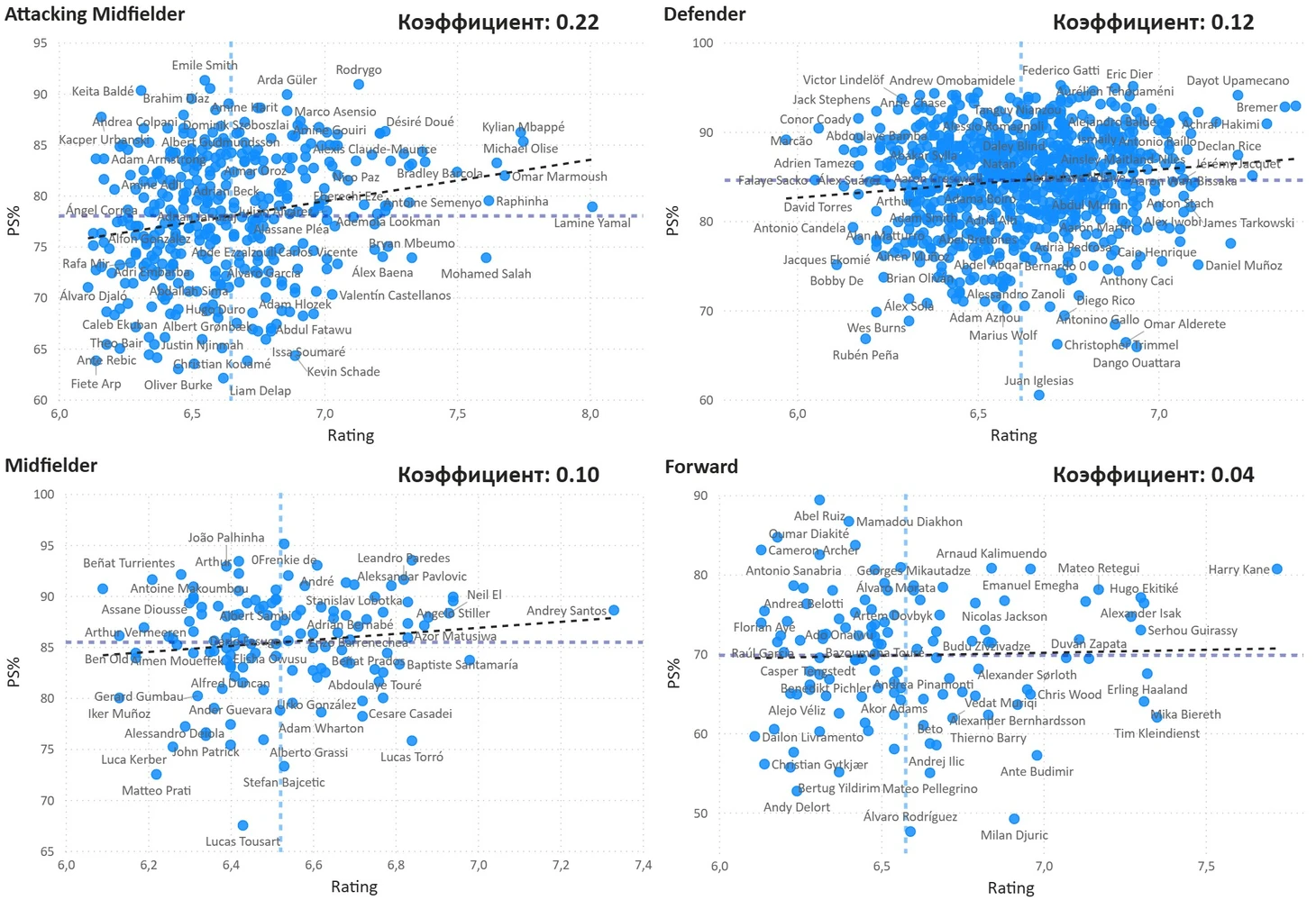 Для защитников и центральных полузащитников зависимость между точностью паса и оценкой ещё слабее (12% и 10% соответственно), но полностью игнорировать её нельзя. То есть точность передач — малозначимый фактор, но все-таки является признаком качественной игры футболиста и в ряде случаев может повлиять на общую оценку.