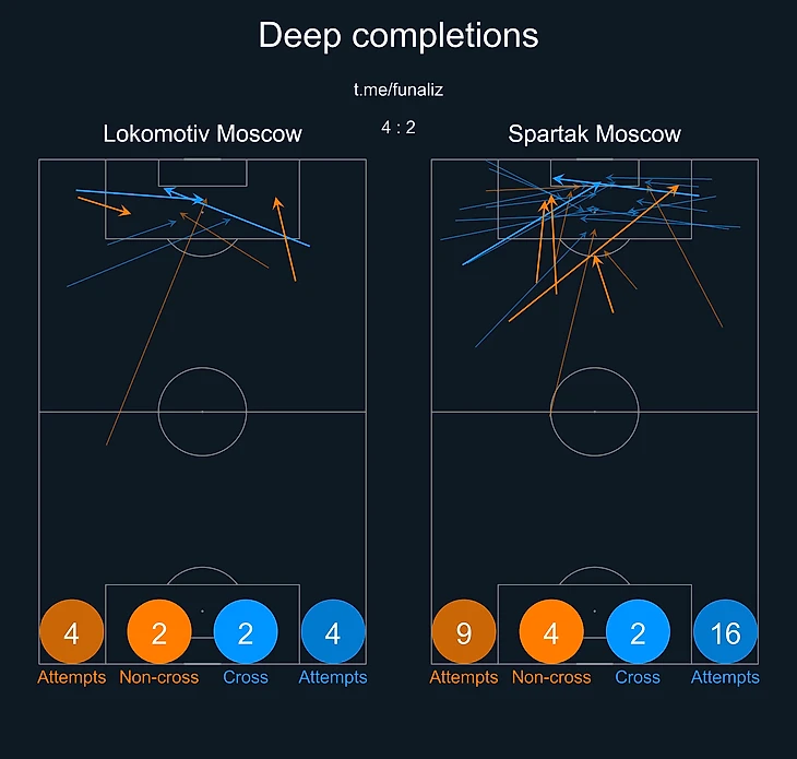 Не стоит забывать и о факторе «быстрого» гола во втором тайме. На 30-минутном отрезке между точным ударом Воробьева и пенальти «Спартак» пробил по воротам лишь раз. Гол немного «прибил» гостей. Не хватало того разнообразия, которое удавалось вносить в игру в атаке до перерыва, а также динамики, передач в касание в финальной трети. «Локомотив» опустился глубже (командно) и успевал реагировать на перемещения оппонентов. «Спартак» пытался взломать плотный блок передачами за спины защитникам, но это не позволяло действительно обострять игру с последующей доставкой мяча в штрафную.