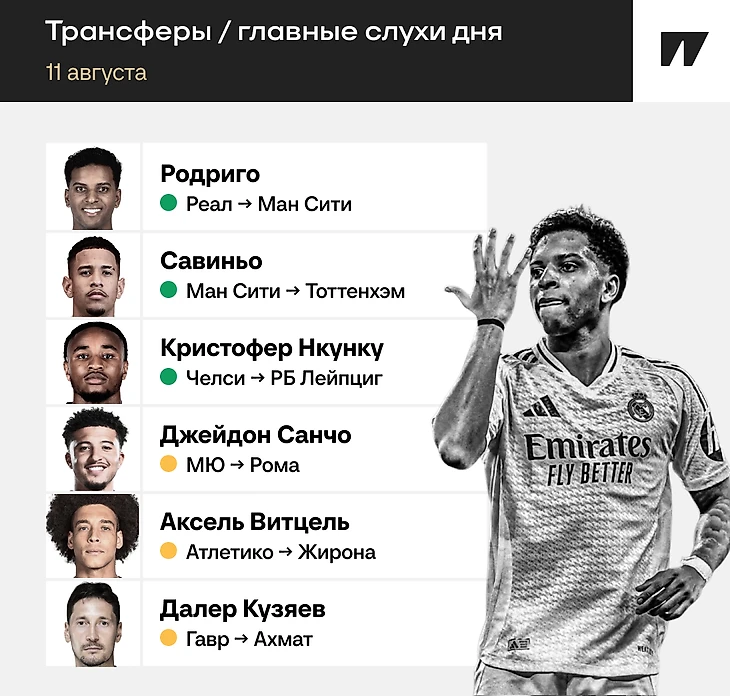 Бразилец почти наверняка покинет «Реал». Он хочет остаться в Мадриде, но сейчас решать Хаби Алонсо: если посадит Родриго в запас, тот рассмотрит предложения. «Мадрид» запросит 90 млн евро и открыт к продаже. Бразилец – давняя мечта «Сити» и лично Пепа Гвардиолы. Еще «Сити» рассматривает Хави Симонса.