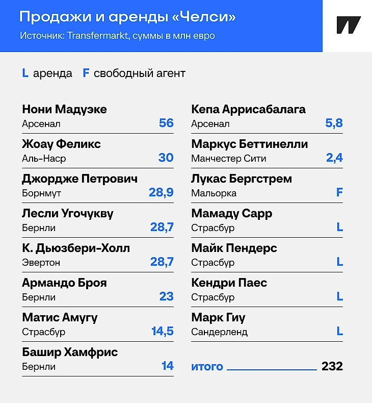 Лондонцы активно продают тех, кто не подошел проекту. «Бернли» спас «Челси» от Армандо Брои и Лесли Угочукву, заплатив за них около 50 млн евро. Кирнан Дьюзбери-Холл ушел в «Эвертон» почти за ту же сумму, за которую пришел (продали за 30 млн евро, купили за 35 млн). Избавились от Жоау Феликса – «Аль-Наср» вывалил 30+20 млн евро. Наконец отпустили Кепу Аррисабалагу – за 6 млн евро его забрал «Арсенал». Соседи завернули и Нони Мадуэке аж за 56 млн, а перспективный вратарь Джордже Петрович укатил в «Борнмут» за 29 млн.