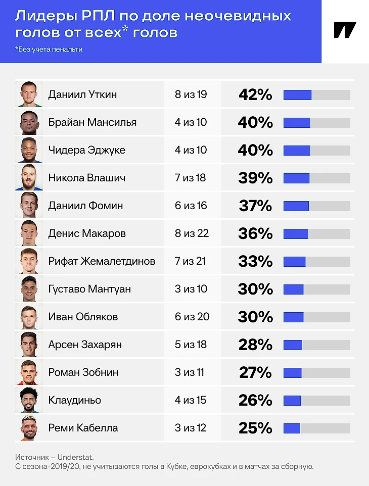Возьмем голы, оцененные в 0,05 xG или ниже, с сезона-2019/20. Во-первых, потому что удобная дистанция, на которой выборка репрезентативна. Во-вторых, те же хронологические рамки установлены в исследовании про Гринвуда – у нас же небольшое соревнование, логично использовать одну точку отсчета. В-третьих, так удастся зацепить часть звездных легионеров еще до отъезда из России.