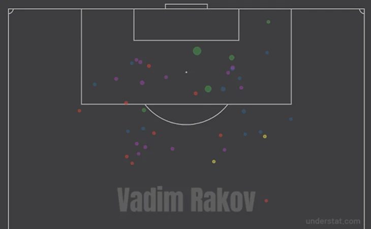 Раков – лидер этого сезона по ударам, но только 2 из них весят больше 0,1 xG. А за все время в РПЛ таких ударов всего 6. Из 41!