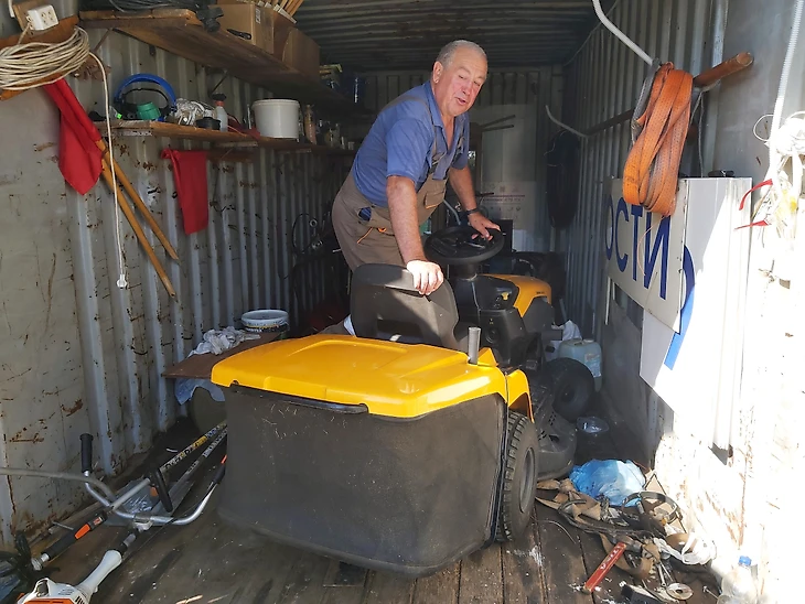 Мы подходим к небольшому гаражу, пристроенному к трибуне стадиона. Леонид Иванович с гордостью демонстрирует аппарат, на котором он готовит футбольное поле к каждому матчу. Недолго думая, Леонид Иванович приводит технику в рабочее состояние и деловито выезжает из гаража на резиновую дорожку.