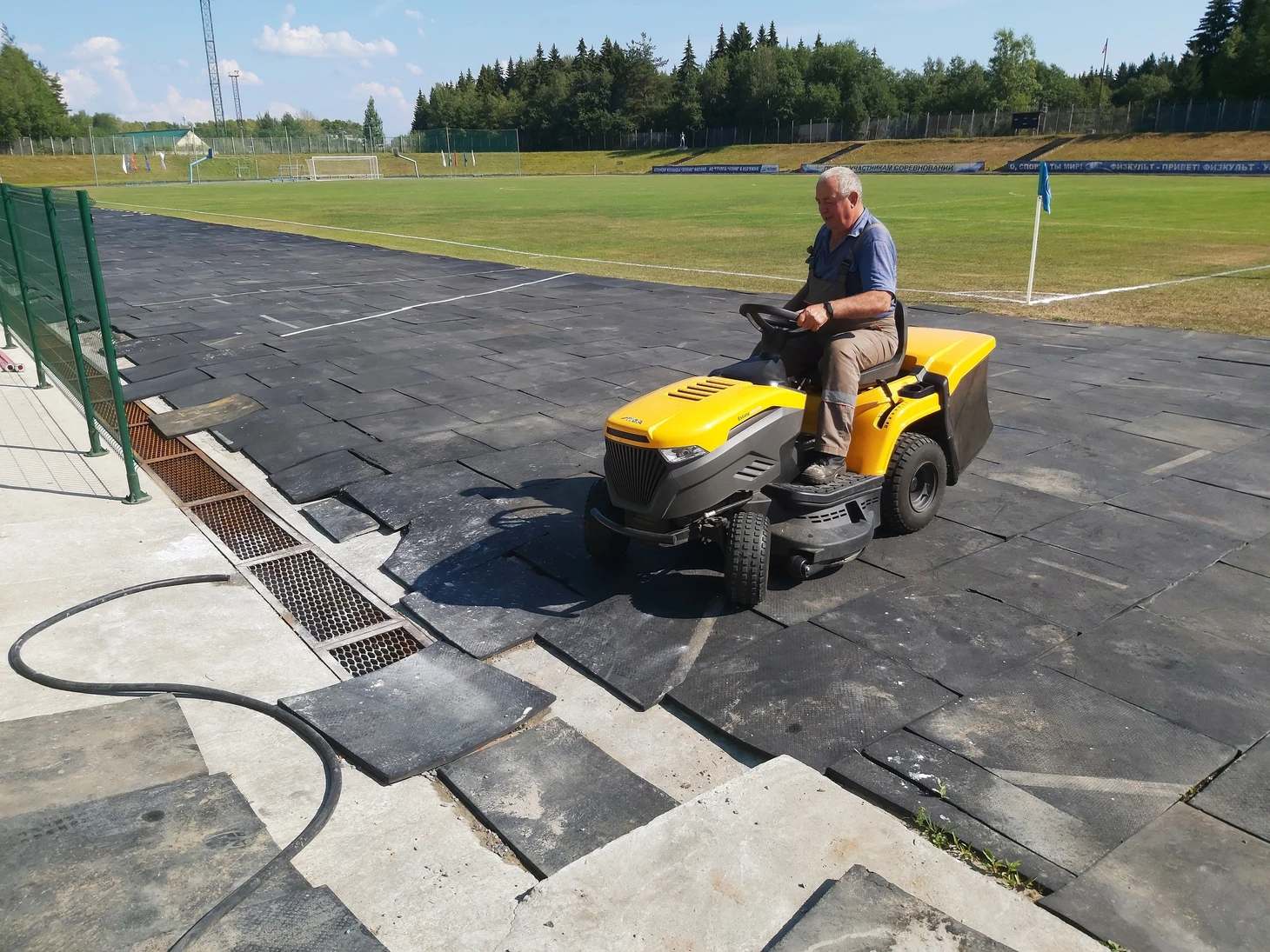 Мы подходим к небольшому гаражу, пристроенному к трибуне стадиона. Леонид Иванович с гордостью демонстрирует аппарат, на котором он готовит футбольное поле к каждому матчу. Недолго думая, Леонид Иванович приводит технику в рабочее состояние и деловито выезжает из гаража на резиновую дорожку.