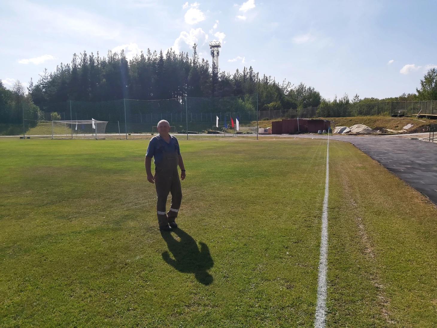 С Леонидом Ивановичем, назначенным ответственным за проведение небольшой экскурсии по стадиону, мы выходим на футбольное поле. Некоторые участки выгорели и имели неестественный желтоватый оттенок. Оно и не удивительно – жара в Коряжме стоит не первый день. Разметочные белые линии выглядят весьма свежо, словно последний метр был докрашен всего несколько минут назад. Однако к геометрии линий могли возникнуть вопросы. Но Леонид Иванович все объясняет.