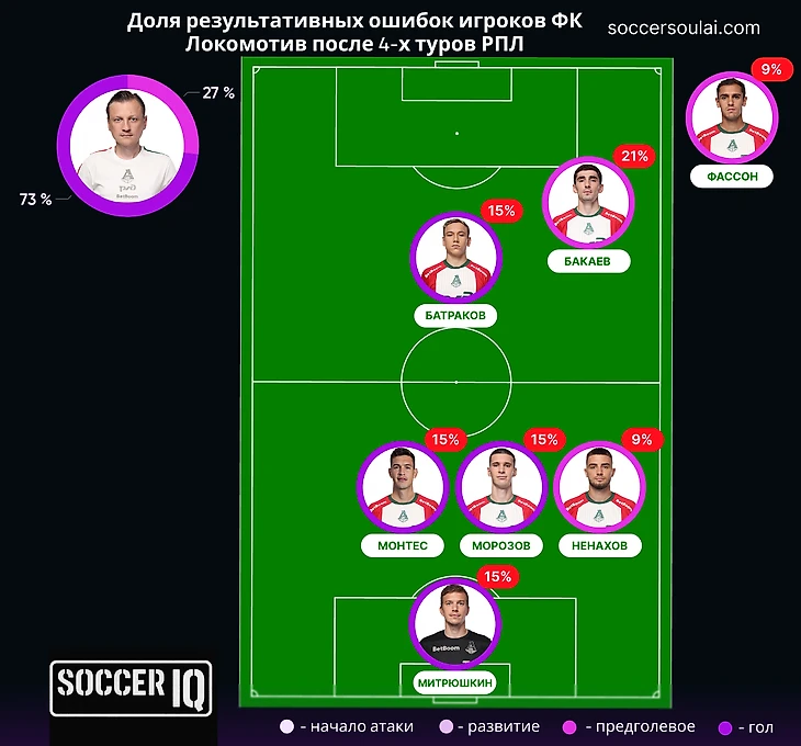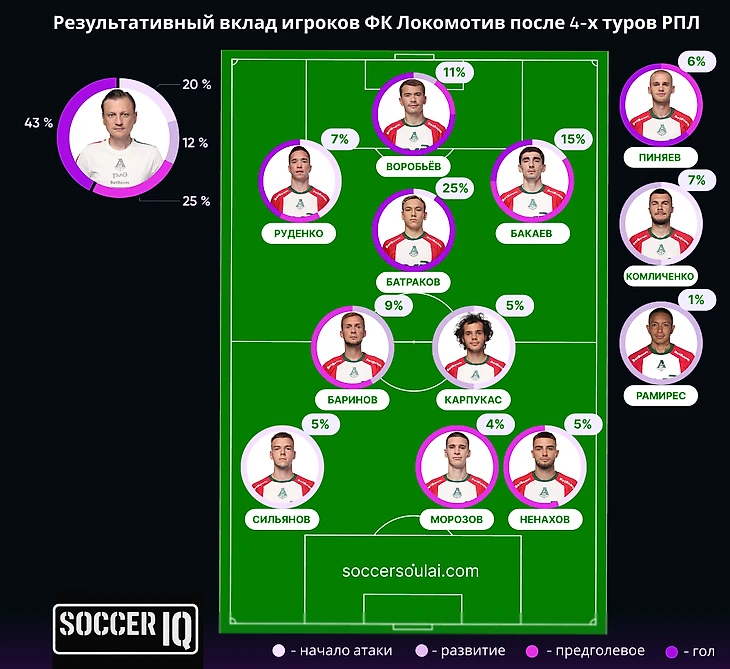 Для футбола Локомотива характерна многоэлементность – прямо сейчас это наиболее сыгранный коллектив РПЛ в плане командных взаимодействий. Двух- и многоэлементные голевые атаки составляют 75%, что очень высокий показатель! Таким образом, сразу 8 из 11 игроков основного состава имеют не эпизодический, а довольно заметный голевой вклад, включая линию защиты.