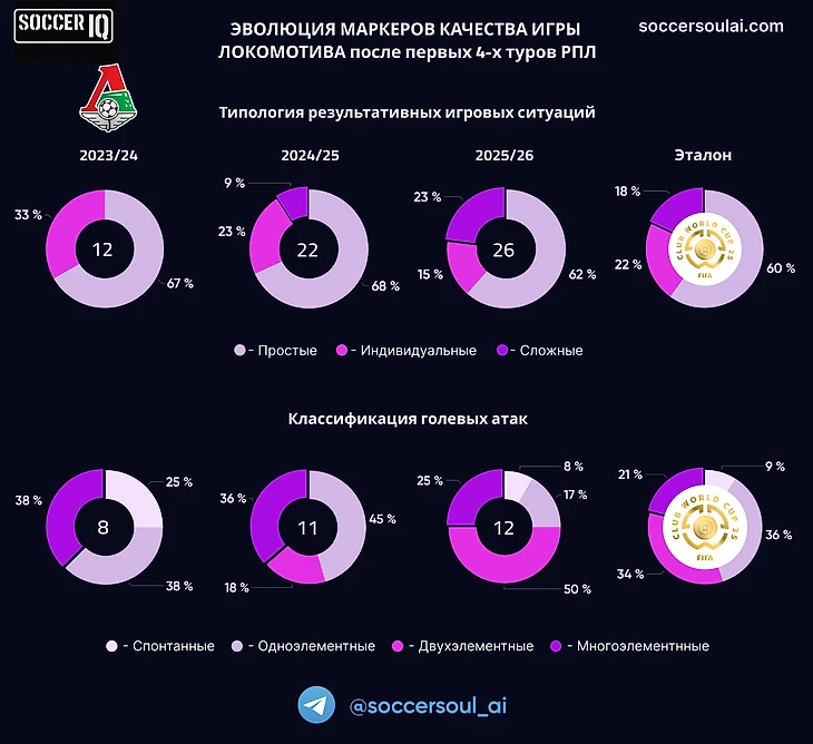 С точки зрения классификации голевых атак, увеличивается только их общее количество. Доля многоэлементных атак сокращается, но только относительно результативности атак прочих классов, поскольку общее количество балансирует в тех же пределах (3 – 4 результативных многоэлементных атаки за 4 тура) и она по-прежнему остаётся очень высокой для современного футбола. Кроме того, доля атак с двумя и более игровыми ситуациями перед завершающим ударом составляет у Локомотива - 75%, что существенно выше современных клубных эталонов!