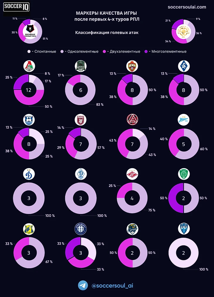 Пари НН забивал только в спонтанных атаках, оба Динамо – только в одноэлементных. Двухэлементные результативны у Локомотива (50%), Акрона (43%), Зенита (40%) и вышеописанной тройки ЦСКА-Крылья-Балтика (по 38%). 50% доля у Сочи, но здесь опять же мала выборка голов.