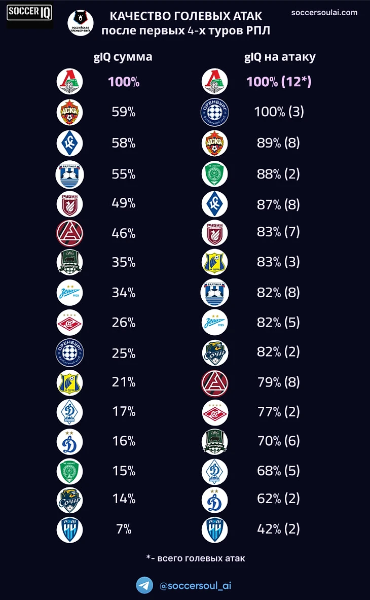 ⚠️Формально, для турнирных показателей не важно, являлся гол результатом серии игровых ситуаций, разрушивших оборонительные построения соперника, либо стал итогом случайного рикошета или следствием ошибки. Но, в масштабе всего турнира, очевидно, что на случайностях далеко не уедешь и gIQ отражает кроме прочего командные взаимодействия между игроками.
